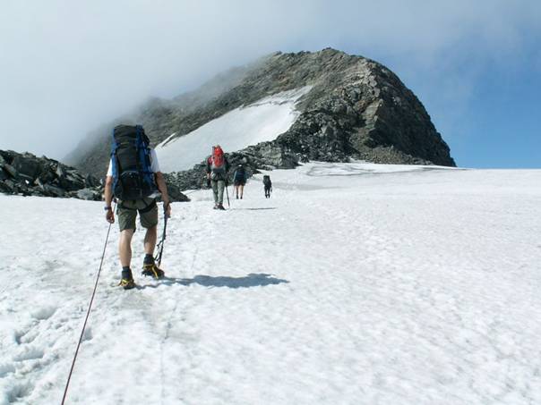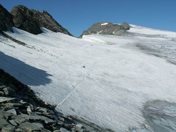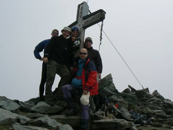 Účastníci: Janek, Viktor, Inža, Lampič, Míra 18.08. – Na místo spaní (vedle portálu železničního tunelu za Bad Gasteinem, 1250m) jsme dorazili v 1.00 a již v 7.15 jsme vstávali. Před 8.30 již vyrážíme. Příjemným údolíčkem po lesní cestě po půl hoďce dorážíme k začátku prudkého výstupu do sedla. U cedule s mapou počítáme odhadovaný čas na naše nocležiště chatu Osnabrucker (2040m), podle dostupných informací to počítáme na dalších 11 hodin, je 9, tak to máme co dělat. Svižně stoupáme vzhůru, hranici lesa překonáváme rychle a nad ní také vylézáme z mlhy údolňačky. Výhledy jsou nádherné. Do sedla Korntauern – 2459m dolézáme za 2,5 hodiny, o více než o 1,5h rychleji než slibovala cedule v údolí. To nás uklidní a máme pohodový oběd. Za sedlem nás čekaly nízké mraky a vítr. Po krátkém sestupu jsme nastoupili do houpajícího traverzu, krátce nahoru, krátce dolů a tak pořád dokola. Mlha ustupovala výjimečně. Stožáry vleků jsme poznali, ale dráty kabinkové lanovky jsme nepoznali. Horní stanice lanovky (2650m, 14.00) je kousek pod Hannover hutte. Pauz na svačinky máme dost. K chatě to už je totiž jen 4 hoďky. Pokračujeme v traverzu hřebene někde nad námi se tyčí Ankogel. Traverz končí výstupem do sedla 2674m. Pak se konečně více otevřeli výhledy, jsou vidět malé ledovce Ankoglu a hřebeny kolem. Sejdeme o úroveň níže kolem jezera a již vidíme chatu, je pouze 17.00, takže další větší pauza. Závěr sestupu k chatě vede kolem krásného vodopádu a v 18.00. jsme pohodlně na chatě. Čeká nás večeře, výhledy na Hochalm spitzi (úžasný pohled, škoda že nemáme další den, byl by to krásný výstup) a pivečko. Zázemí chaty nemá chybu a spaní bylo pohodlné. Jen Janek stěžoval na vlnobití palandy (pro 5 lidí), na často otáčejícího se Míru prý pořád volal Viktore. 19.8. – Vstáváme po šesté, krásné jasno, 4 C. Ve vzduch je vidět, že se různě vytvářejí a ztrácejí mraky. V 7.30 zahajujeme výstup. Opět kolem vodopádu vzhůru, nad vodopádem je už odbočka na Ankogel. Cesta vede pěšinkou střídavě po šutrech a trávě. Vystoupíme až nad sněhové pole a značka nikde. Nakonec ji spatříme na protějším hřebínku (musí se sejít na sněhové pole a nad jezerem přejít na druhý hřebínek). Za mlhy není šance cestu trefit. My máme štěstí, ale mraky z údolí jdou výše a výše. Brzy jsme u hlavního ledovce, do výstroje a rychle výš a výš, mraky už občas dorážejí i na ledovec. Cesta po ledovci je pohodová, jen občas překračujeme trhliny. Cesta po ledovci trvá lehce přes hodinu a v 11.00 jsme před závěrečným hřebínkem. Na něm nás čekalo i trochu lezení a před dvanáctou jsme na vrcholu. Zima není, ale všude mraky, jen občas se ukáže výhled. Ankogel je hora sestavená s nestabilních šutrů, nebudí to důvěru. Při výstupu si zranil Lampič o skálu hlavu, Inža to chce řešit dezinfekcí a nožem. Čepice zabránila nutnosti šití. Oběd na vrcholu je pohodový, ale všichni tušíme, že u auta brzo nebudeme, Janek tajně doufá v pátou. Počáteční sestup vede po nestabilních skalách a šutrech, neledovcový výstup (náš sestup) není hezký. Brzo scházíme pod mraky, takže zbytek cesty vidíme, kudy jsme včera šli. Kolem 15.00 míjíme včerejší horní stanici lanovky. Traverzem opět do včerejšího sedla a hnusně dlouhý sestup do údolí. Abychom nedošli špinavý, studená přeháňka nás promyje. U auta jsme v 19.00. Po cestě domu nás před Werfenem chytla bouřka a polevila až za dalších 200 km. Janek a noční MHD nás dostali do postýlek. David Následují 4 fotky: