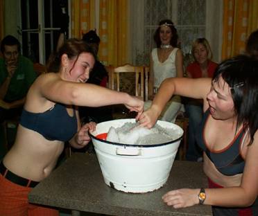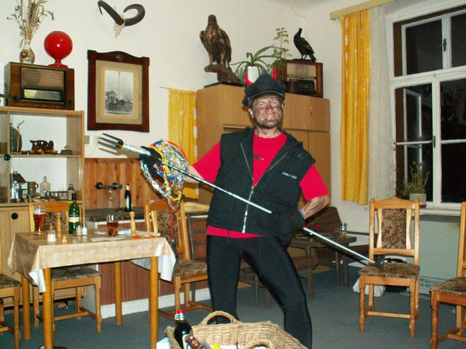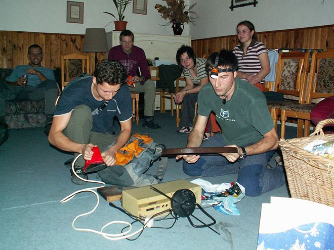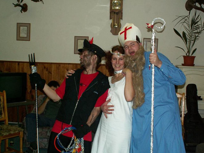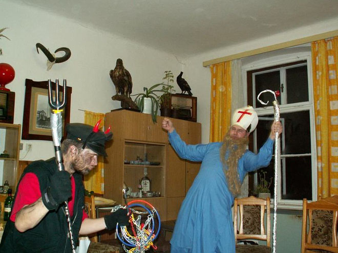 V sobotu ráno se všichni nadšeně vypravili se svými často zbrusu novými prkýnky do bílé stopy. Potíž byla v tom, že bílá stopa nebyla až tak bílá…. Hyzdilo jí spoustu jehličí a kamínků a všelijakého dalšího sajrajtu. Někteří borci tak dokonce vzdali své běžecké úsilí a dali přednost romantické procházce ve dvou (rozuměj mužích…:-)). My ostatní jsme ve skrytu duše doufali, že se nám ta pravá bílá stopa teprve ukáže. A opravdu jsme se dočkali – okolo Pěticestí se sněhové podmínky radikálně zlepšily a my jsme si tak mohli užít krásného bruslení. Na Pěticestí dokonce dorazilo i sáňkové spřežení s vílou Amálkou poháněné chrabrým Lumpíkem. A ti nejvytrvalejší borci dobruslili až na Masarykovu chatu a zpět. Večer šéfkuchař Peter připravil nadpozemsky dobrý gulášek! A pak už nic nebránilo tomu, aby se k nám snesly Nebeské Bytosti. Mikulášovi opět trochu povyrostl fous, čert měl tentokrát opravdu originální ocas, jen ten anděl byl letos nějaký moc mírný, měl by příště trochu přitvrdit… A jak pravil čert: „Úkoly budou dlouhé a těžké, neboť rok byl taky dlouhý a těžký…“. A tak se drazí turisté lopotili s předváděním náročných scének a mohli jsme spatřit výjevy vskutku ojedinělé – jak Fidel klábosí s Hugem, jak nejmenovaný prodejce z HP prodává svůj zbrusu nový model IQ151, jak to vlastně bylo se slavným výstupem Pavla Béma na Everest, jak se vyměnily další děti v porodnici, jak probíhají nefalšované bahenní zápasy ve sněhu, jak si Franta Procházka šel uložit svůj výdělek do KB či jak precizně fungují píchačky nejenom na vsetínské radnici.