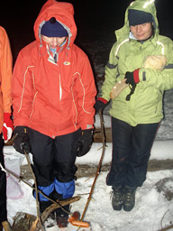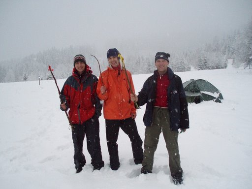 Po splacení směšné částky za tak krásný večer nám byla poskytnuta nedaleká „chajda“ k přespání. Po ohledání místa však všichni z nás dali přednost spaní ve stanu. Večer ještě nebyl v dolině žádný sníh a navíc, když už ty stany vlečeme, ať mají také to využití, ne? No, neprohloupili jsme. Někteří z nás se hned uchýlili ke spánku společensky unaveni, jiným ještě nadšení ne a ne opadnout a buď své okolí rušili stále se nedařícím a dlouhotrvajícím postavením stanu – teda Králíku, to si Lenku moc nenaučil. Anebo oklepávali hromadící se sníh na stěnách stanů pomocí právě upletené pomlázky. Tady se nám Inža tak strašně těšil na koledu, že odpočítával minuty do půlnoci. Ale kupodivu žádnou slečnu na své švihání do stanu nevylákal, a tak si musel počkat do rána. Překvapením hned po probuzení se stal nečekaný příval sněhu, který zasypal stany, že bylo mistrovským kouskem dostat se z nich. Mou maličkost s Honzou dokonce prakticky zavalil. Co z toho plyne? Neberte si letní stany, i když jste duchem naladěni na jaro, počasí s vámi nemusí souhlasit. Jo a mimochodem, i na letní karimatce a s nekoženýma botama se dá přežít. Promiň, ale to sem si, Inžo, nemohla odpustit. Následující pondělní ráno se tedy neslo v duchu velikonočním, každá slečna dostala od trojice koledníků – v pořadí Inža, Luboš, Janek – pěkně na prdel. Vařených vajíček se jim dostalo ale jen od poctivé Kristýny, ostatní nabídly „pouze“ čokoládové pochutiny, kterými koledníci tak strašně pohrdali, že je okamžitě sbalili do kapsy.