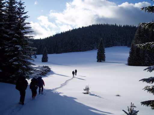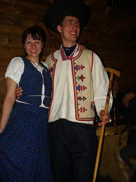 Poslušně hlásím, že noc proběhla bez ztrát. Ráno jsme se s radostí pustili do vaření. Lubošovi se dokonce povedl umělecký kousek a ve své ospalosti rozlil trochu toho čajíku Inžovi do spacáku, zřejmě, aby tak zvýšil celkovou hmotnost batohu a dostal se tak během dne v pochodování před něj, jak se následně i stalo. Inža mu za to samozřejmě během dne nezapomněl několikrát hlasitě poděkovat. Následoval den ve znamení dobytí nejvyššího bodu tohoto pohoří, který se honosí názvem Fábova Hoĺa. Cesta k němu vedla přes polomy, které však nabízely krásnou vyhlídku do kraje. Vrchol jsme zdolali ve svižném tempu, a to i přes nemalé avšak nedlouhé stoupání. Nahoře, jak nám již předem bylo avizováno, to stálo za to! Jooo, takové velké husté smrky vás při bránění ve výhledu dycinky potěší. Tak jsme dřepli na nejbližší mýtinku a začali se za slunečních paprsků ládovat obědem. Sestup nabral strastiplnějšího rázu, nejenže ty zákeřné smrky byly přetíženy a každou chvíli upustili nečekanou salvu sněhu rovnou někomu za krk, navíc se i cesta proměnila v jedno velké kluziště a myslím, že nikdo neutekl bez ztráty kytičky. Každý hodil pěknou prdelačku, jak se sluší a patří. Byli však i tací, kterým se nepoštěstilo a Králík si tak zřejmě narazil klíční kost. Večer jsme tedy sestoupili do nedalekého sedla a to si prosím poznamenejte všichni do zápisníčku. Až sem příště pojedu, první, kde se stavím je chata Zbojská. Ano, opravdu nezklamala, slovenská salaš, o které se nám ani nesnilo. Uvítala nás velkolepě. Živá hudba, stylové vybavení, zahrnující sekyrku Jánošíka, všechny velikosti kravských zvonců či výstavu zdejších krojů. Zkrátka salaš, jak má být. Po načerpání sil z českého točeného kozla jsme podlehli a vyzkoušeli tamní halušky a věřte, nezklamaly, ba naopak. Co se domácího pití týče, nezklamala nabídka ani po této stránce, obsluha nosila Borovičky a Demänovky, co hrdlo ráčilo. Postupem večera jsme se přidali i k místnímu osazenstvu tvořeného Slováky a zřejmě též náhodně kolemjdoucími Francouzi. Bylo to tedy multi kulti, jak má být. Po přibližně dvou hodinkách se rozezněly i naše hlasivky a zábava nabírala na síle, po ještě jedné rundě už se aj ogaři rozhoupali a vyzvali galánky do kola. Nejvíce si to však užíval místní bača, který si až převelice oblíbil Kristýnku. Jak tak večer postupně gradoval, nebylo nikomu ani tak divné, že se Inža s Kristýnou objevili v krojích zapůjčených místňáky.