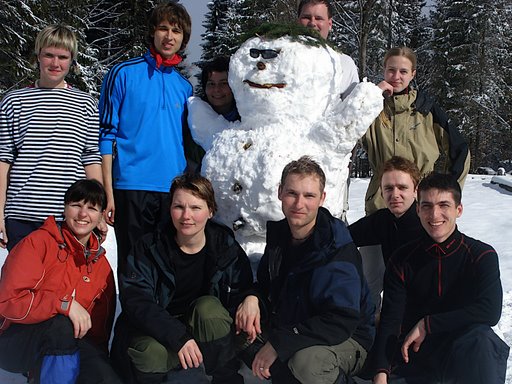 Odpoledne se konečně počasí umoudřilo, slunce se rozzářilo a to naši mysl potěšilo. Ti odolní z nás se odkuklili dokonce jen do triček a na blízkém sedle jsme neodolali pokušení a uplácali huhuláka a kde jinde, než rovnou na vozovce, ať si to přeci to jedoucí auto pěkně užije. Následovalo pár romantických fotek s IN sněhulákem a poté, ať se nám to neplete, jsme si dali repete a doplácali mu ještě jednoho kámoše sloužícího převážně jako stativ pro foťáky.
