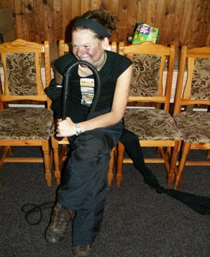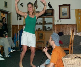 Guláš si vzal letos na starost Peter. Jako správný šéfkuchař měl za sebou celou řadu děvčat, matek i budoucích matek, které běhaly po kuchyni jako čiperky, krájely cibuli, loupaly česnek .. no prostě dělaly všechno, co Peterovi na očích viděly. .. teda skoro všechno. Chlapi zase roztápěli kamna a nosili dříví, takže to v kuchyni vypadalo jako v mraveništi. Nakonec Peter hodil do kastrolu vše, o čem si myslel, že patří do guláše (včetně rumu) a jenom hlídal, aby nikdo bez povolení neochutnával. A hlídal dlouho. My ostatní jsme byli jako na trní, hladoví, jak herci, ale Peter byl neoblomný (teda dal se ukecat, ale … ). Takže jsme se nejdřív nadlábli vším možným, okusili místní specialitu - teplý vaječňák s rumem a se šlehačkou a doufali, že se snad do půlnoci dočkáme i guláše.